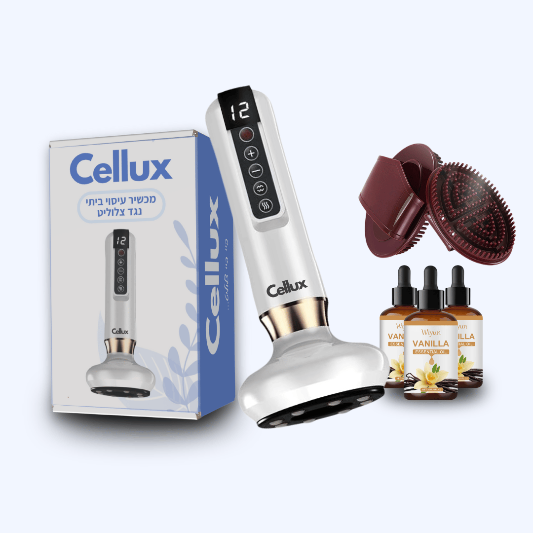 התוכן באתר זה והמידע המוצג בו נועדו לצרכים אינפורמטיביים בלבד ואינם מהווים ייעוץ רפואי, אבחנה או תחליף לטיפול מקצועי. השימוש במכשיר Cellux אינו מחליף טיפול רפואי או פיזיותרפי, ואינו מיועד לאבחן, לרפא, למנוע או לטפל בכל מחלה או מצב רפואי. תוצאות השימוש במכשיר עשויות להשתנות מאדם לאדם, ותלויות בגורמים אישיים שונים. נשים בהריון, אנשים עם מצבים רפואיים קיימים או עור רגיש במיוחד – מומלץ להיוועץ ברופא לפני תחילת שימוש. השימוש במכשיר מיועד לשימוש חיצוני בלבד, על עור שלם וללא פציעות.